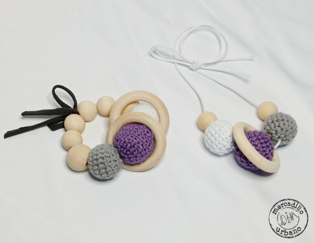 Estimula al bebé con el sonido de las anillas y la textura de las bolas de madera y de ganchillo, mientras le das el pecho.