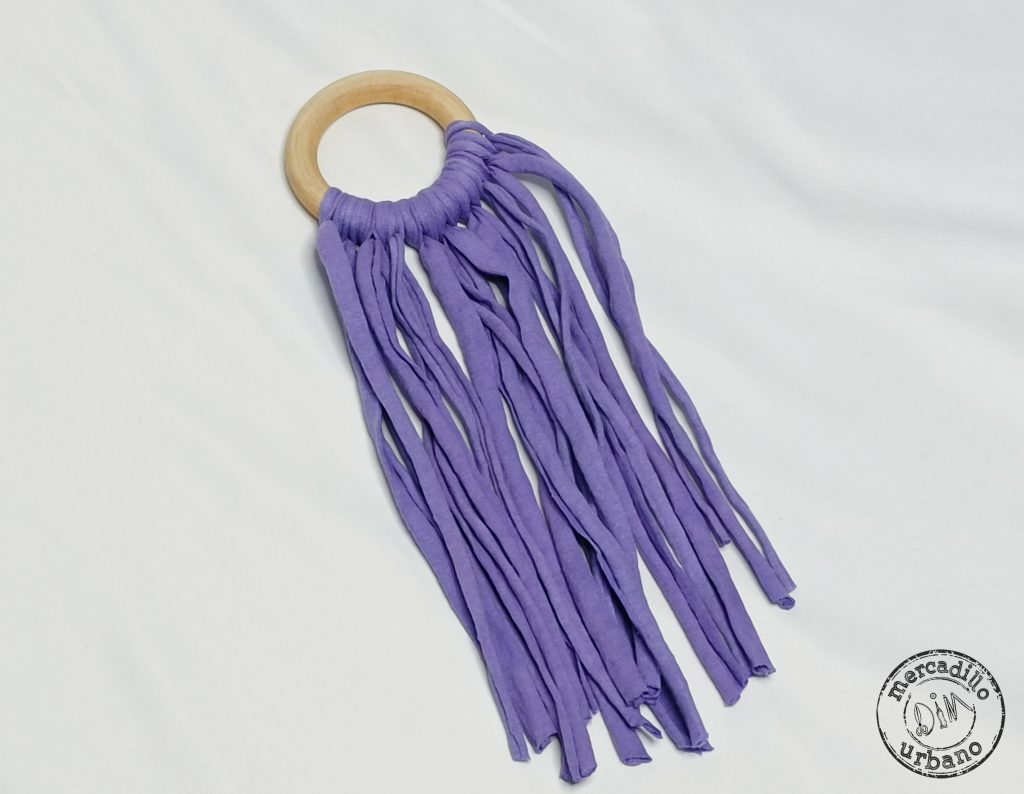 SONAJERO para bebés, estilo Montessori, hecho con bolas de tres tamaños y anillas de madera. Alguna de las bolas están forradas en ganchillo, con hilos de diferentes texturas.